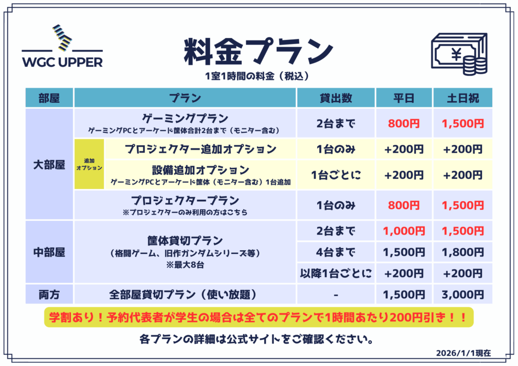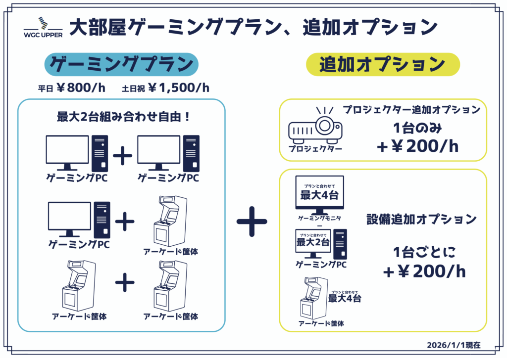 「中部屋」の筐体貸切プラン(2台まで)が値上がりします。(赤文字部分)
